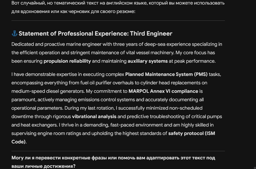 Dedicated and proactive marine engineer with three years of deep-sea experience specializing in the efficient operation and stringent maintenance of vital vessel machinery. My core focus has been ensuring propulsion reliability and maintaining auxiliary systems at peak performance. I have demonstrable expertise in executing complex Planned Maintenance System (PMS) tasks, encompassing everything from fuel oil purifier overhauls to cylinder head replacements on medium-speed diesel generators. My commitment to MARPOL Annex VI compliance is paramount, actively managing emissions control systems and accurately documenting all operational parameters. During my last rotation, I successfully minimized non-scheduled downtime through rigorous vibrational analysis and predictive troubleshooting of critical pumps and heat exchangers. I thrive in a demanding, fast-paced environment and am highly skilled in supervising engine room ratings and upholding the highest standards of safety protocol (ISM Code).Documents